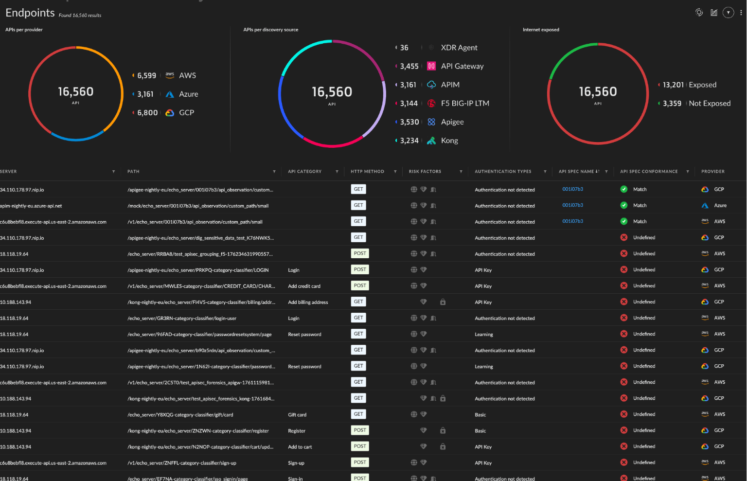 APIランドスケープ全体を可視化し、死角をなくす。ゲートウェイ、ワークロード、クラウド環境にまたがるAPIを自動的に検出し、検証します。シャドーAPI、ゾンビAPI、アンマネージドAPIを発見し、完全な可視化と制御を実現します。