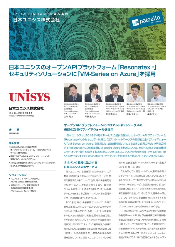 日本ユニシスは、2018年4月にサービスの提供を開始したオープンAPIプラットフォーム「Resonatex™」のセキュリティ対策にパロアルトネットワークスの仮想化次世代ファイアウォール「VM-Series on Azure」を採用した。金融機関をはじめ、さまざまな企業のWeb APIを公開するResonatex™は、稼働基盤にMicosoft Azureを利用している。そのAzure上で金融機関のセキュリティ要件を満たす製品を探していた日本ユニシスが出合ったのが、VM-Series on Azureだった。すでにResonatex™のセキュリティを担保する仕組みとして組み込まれている。